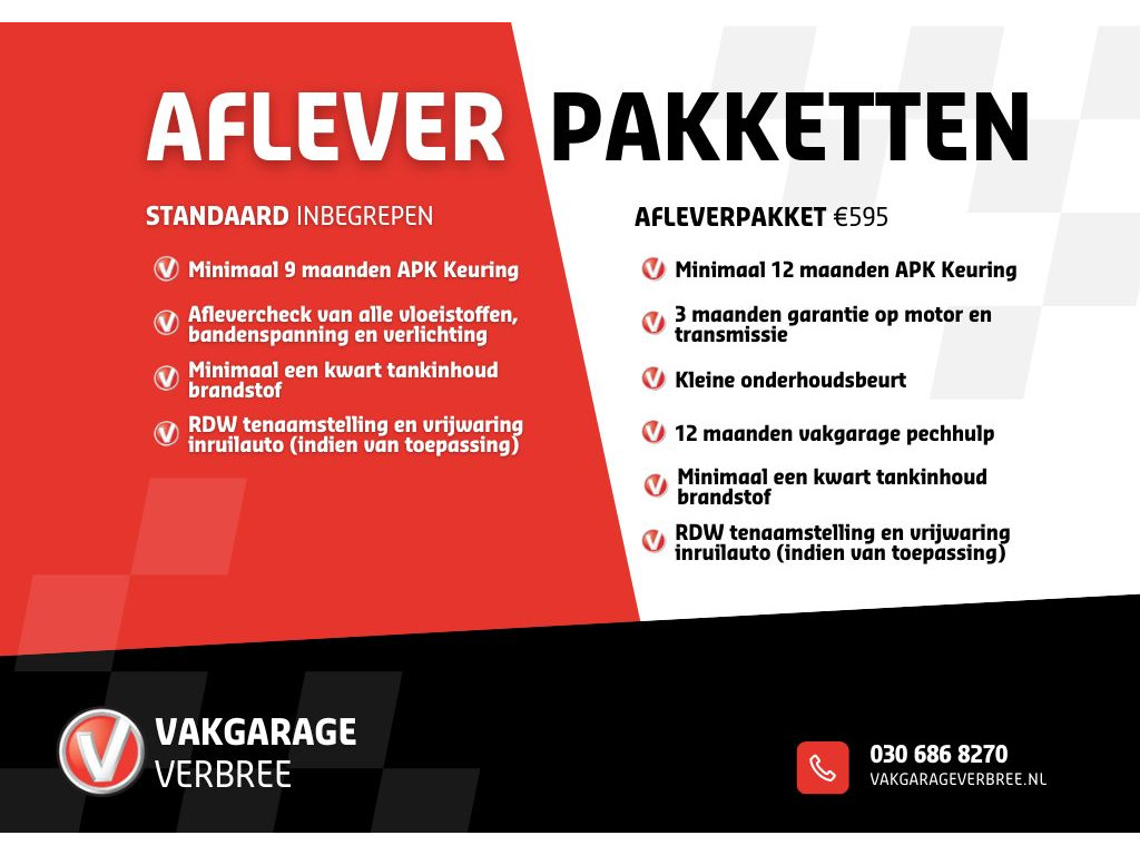 - Basispakket (€ 595): - 3 maanden garantie op motor en transmissie - Minimaal 12 maanden APK keuring - Kleine onderhoudsbeurt - 12 maanden Vakgarage pechhulp - Minimaal een kwart tankinhoud brandstof - RDW tenaamstelling en vrijwaring inruilauto (indien van toepassing)