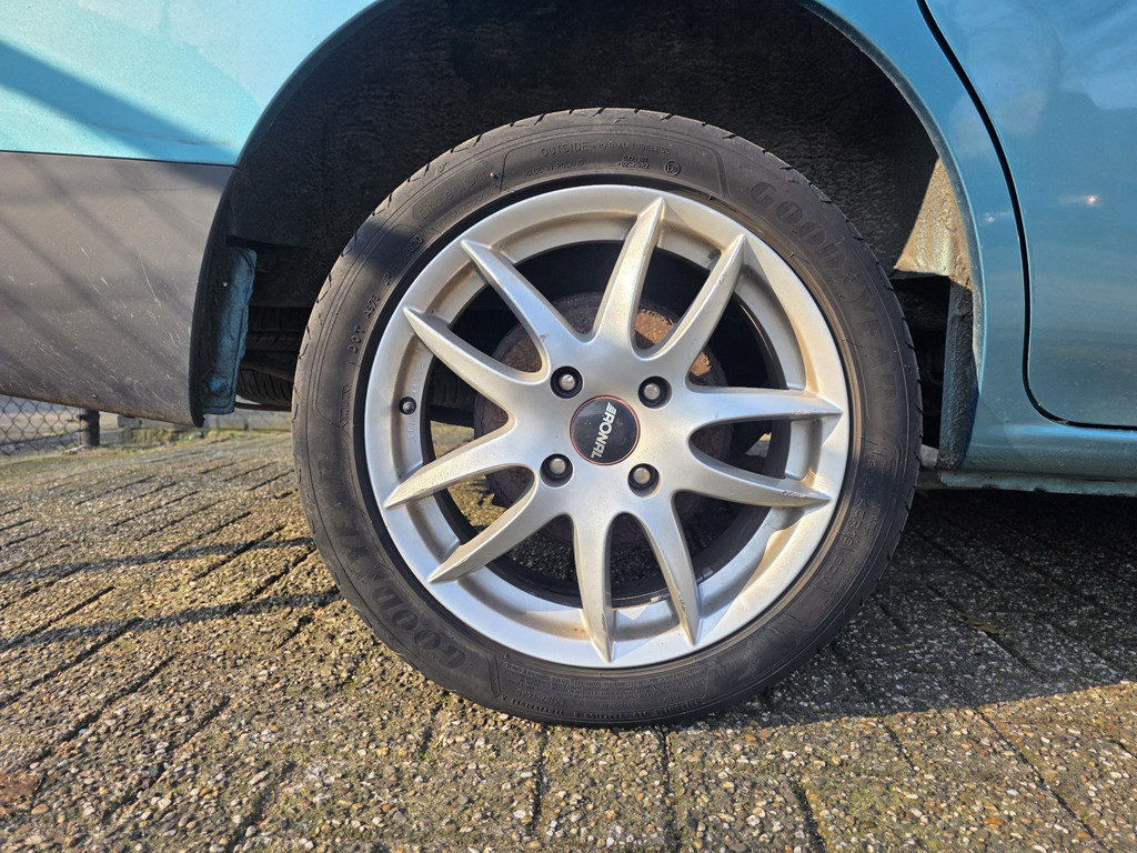 In sportief groen metallic met licht metalen velgen.